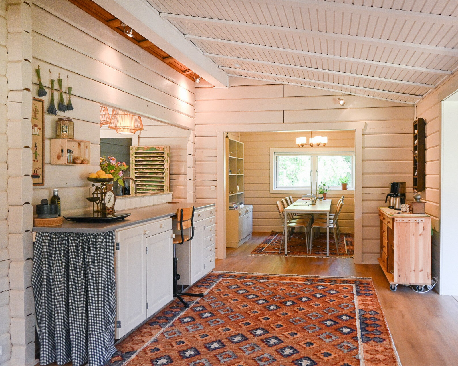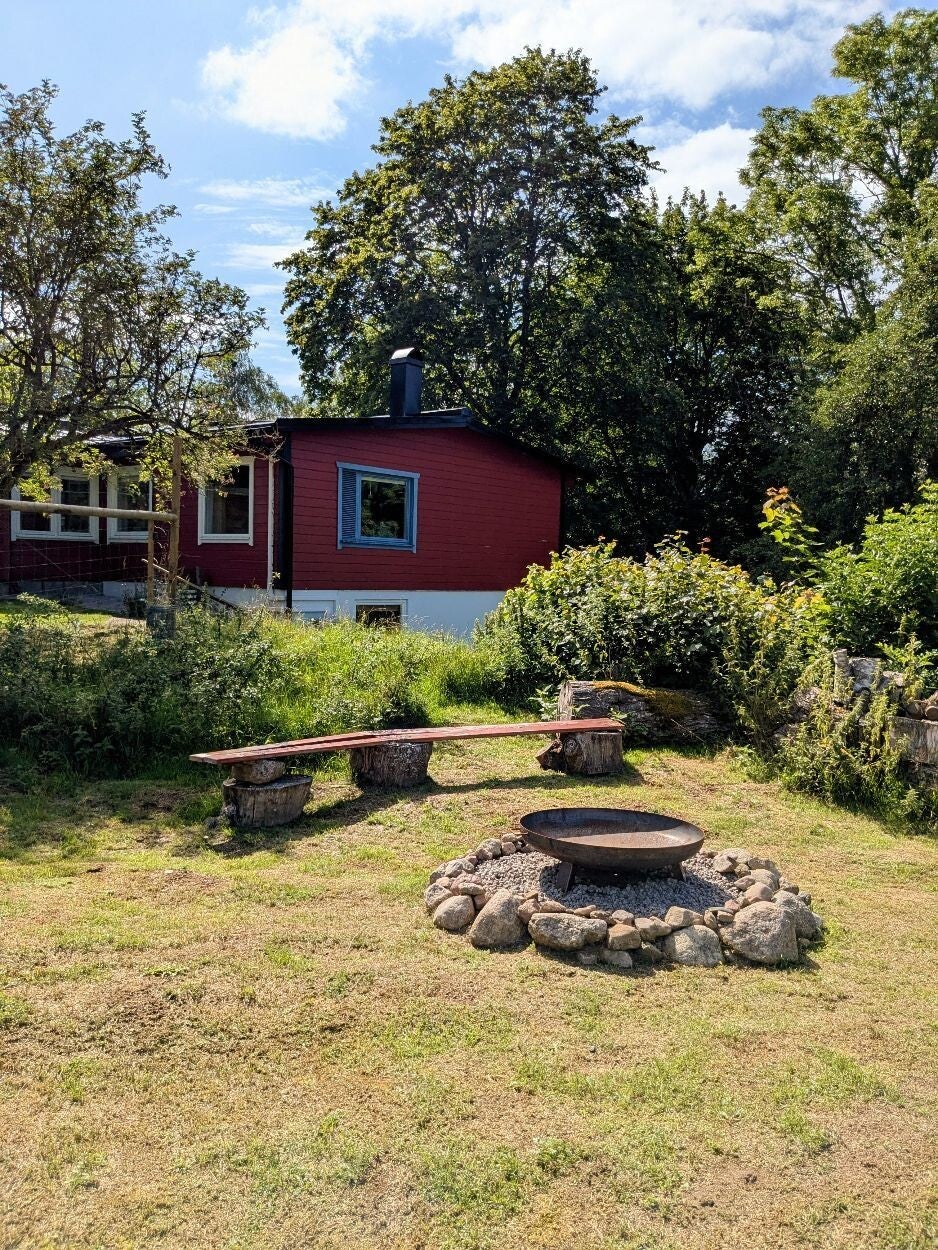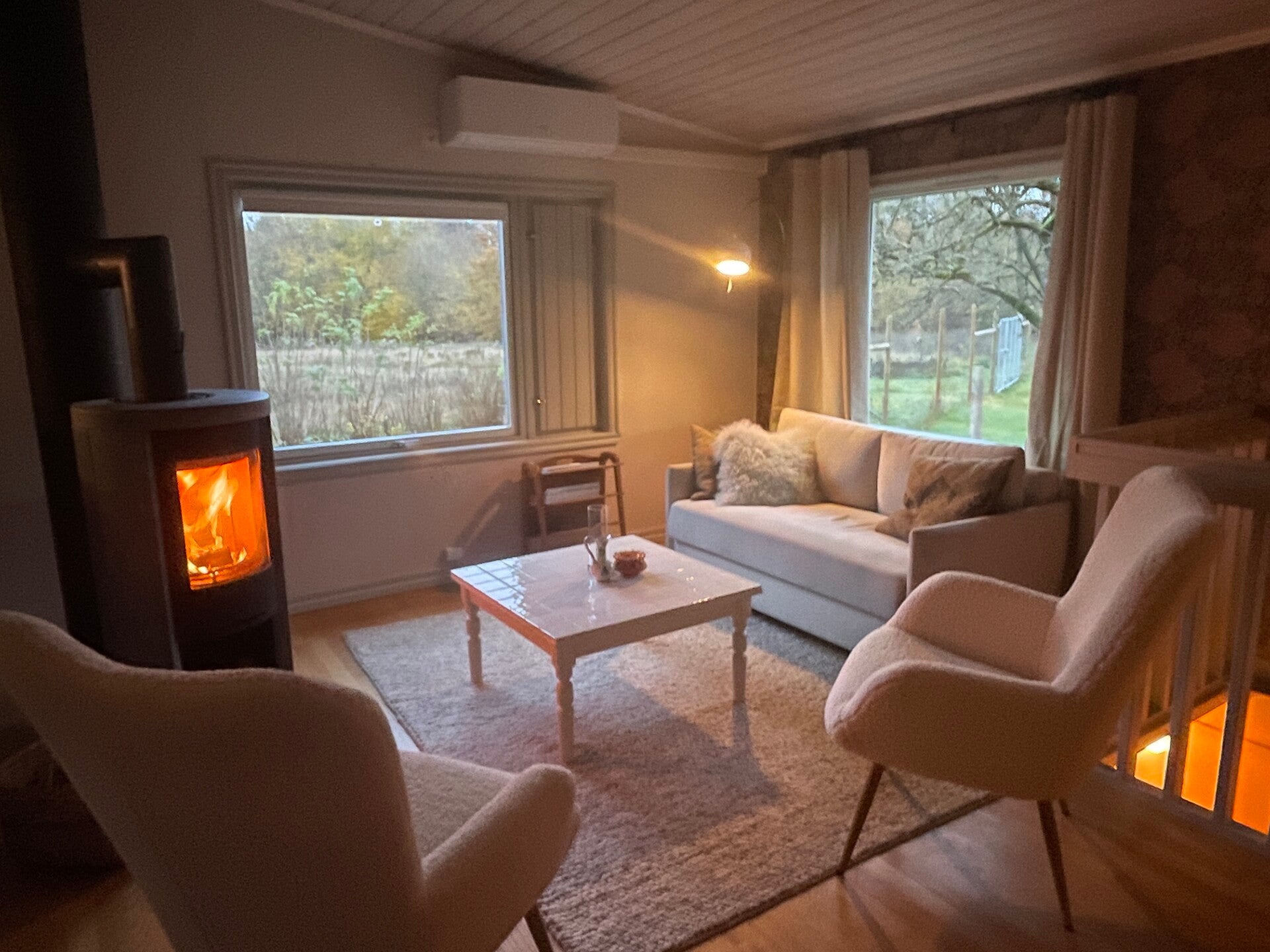 Op de begane grond is een originele Zweedse keuken met vedspis (houtgestookt fornuis) voor slowcooking of opwarmen van water: